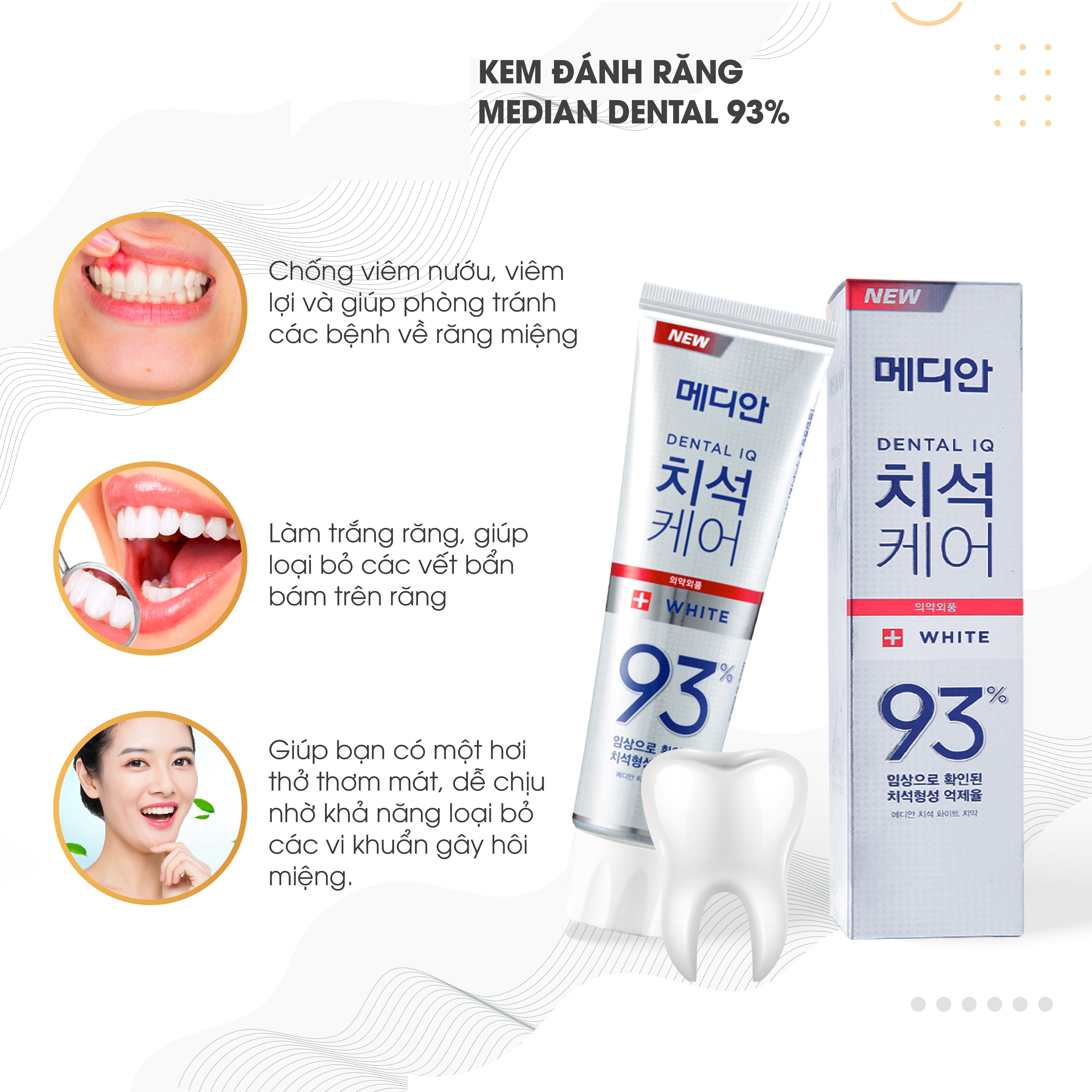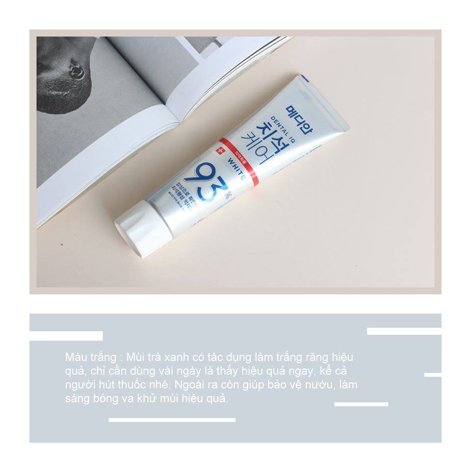 1. Kem đánh răng Median màu trắng (hương trà xanh): Chải sạch, loại bỏ cao răng, làm sạch mảng bám, giúp trắng răng rõ rệt sau 1 thời gian sử dụng. Đặc biệt những ai hút thuốc, uống cafe thường xuyên dùng median màu trắng sẽ giúp giảm ố vàng răng, loại bỏ hơi thở có mùi.