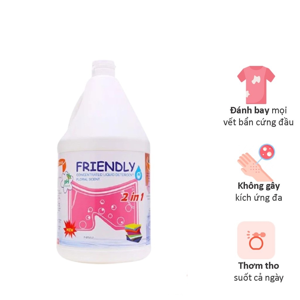 Friendly là sản phẩm giặt quần áo được chế tạo bởi công thức đặc biệt, giúp đánh bay mọi vết bẩn cứng đầu trên quần áo. Sản phẩm có chứa Polyacrylate giúp ngăn ngừa sự trở lại của vết bẩn và đặc biệt không gây kích ứng da. Độ PH trung tính của Friendly mang đến cảm giác mềm mại với da tay và an toàn cho quần áo. Hương thơm nhẹ nhàng, mát dịu đặc trưng của sản phẩm lưu lại sau khi giặt, mang lại cảm giác thơm tho và thỏa mái suốt cả ngày. Nếu bạn đang tìm kiếm một sản phẩm giặt quần áo hiệu quả và an toàn, Friendly là sự lựa chọn tuyệt vời.