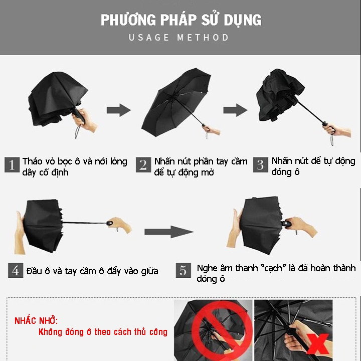 Đóng mở tự động chỉ với 1 nút bấm, thao tác nhẹ nhàng, an toàn – trẻ em cũng dễ sử dụng.