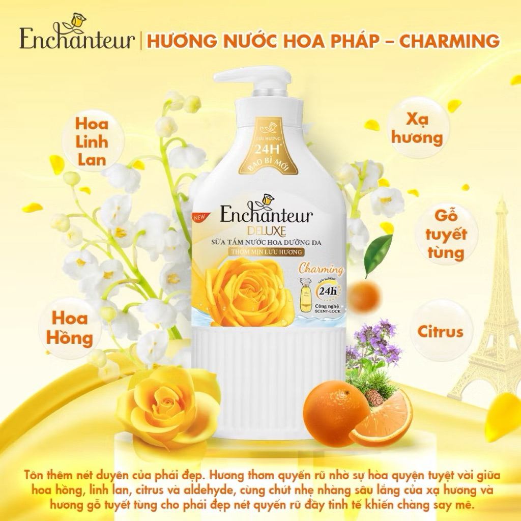 Sữa tắm Enchanteur mang đến trải nghiệm thư giãn và quyến rũ với hương nước hoa Pháp tinh tế. Được thiết kế đặc biệt với dưỡng chất Silk Protein, sản phẩm giúp dưỡng ẩm sâu, cho làn da mềm mại, mịn màng, đồng thời lưu lại hương thơm nhẹ nhàng, lôi cuốn suốt cả ngày.